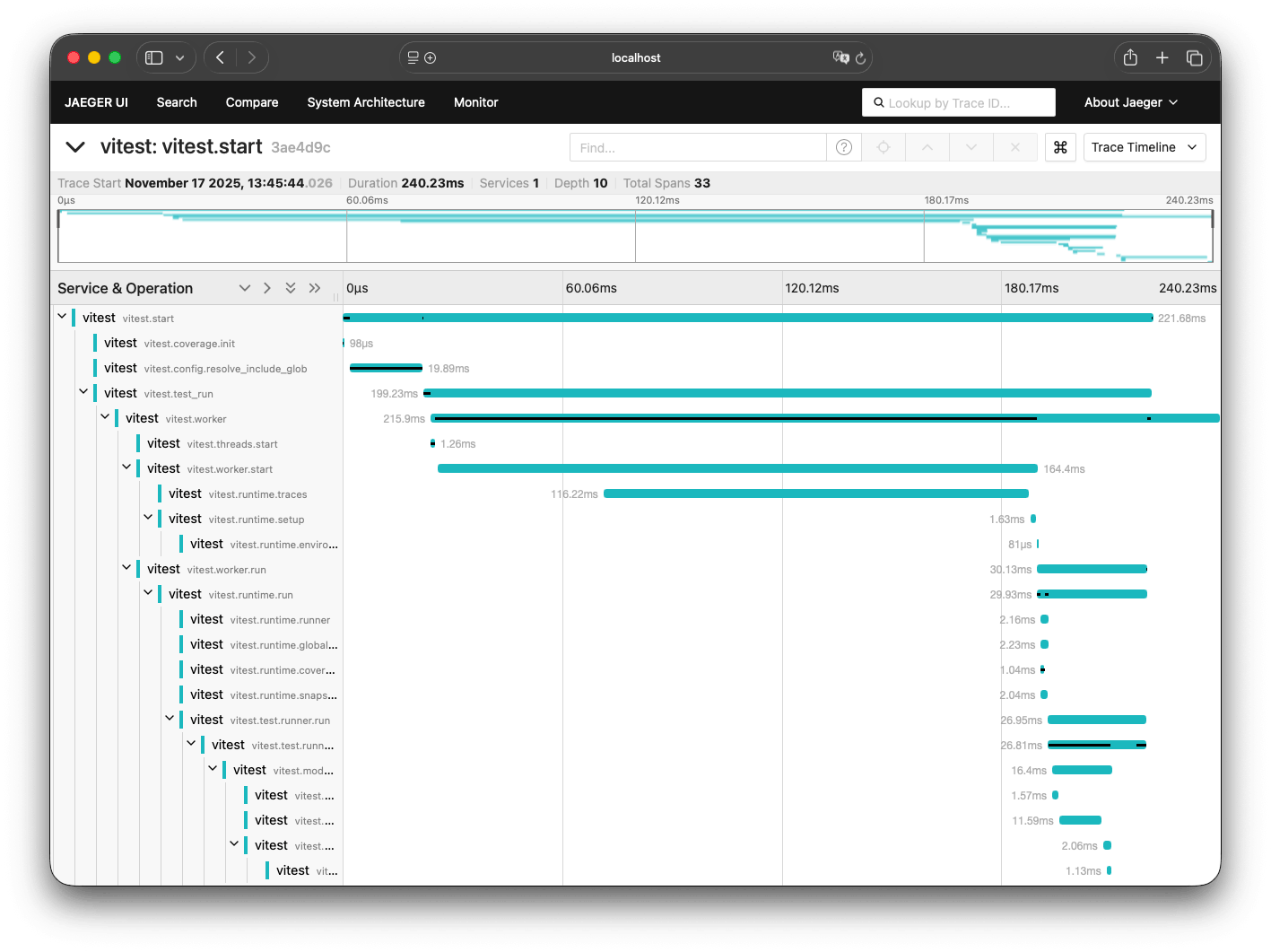 除非 Vitest 在关闭 隔离 模式下运行,否则 OpenTelemetry 初始化会延长每个测试的启动时间。你可在 vitest.worker.start 中查看名为 vitest.runtime.traces 的追踪跨度。